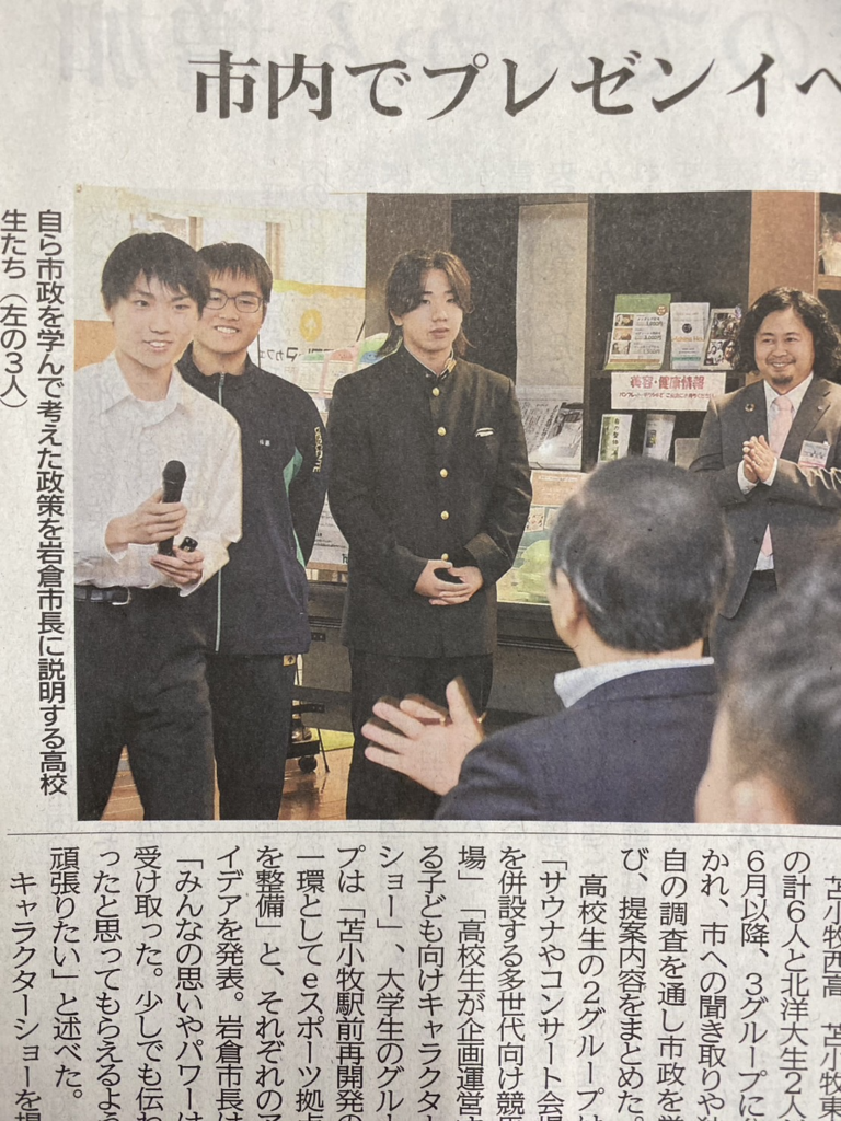 岩倉市長からは苫小牧の将来を真剣に考えてくれる若者に対し、さらなる成長を期待したいとのエールをいただき、参加いただきました生徒さん、学生さんからは市長と顔を合わせ自らの意見を伝えられる場に立つことができたことに喜びを感じていただくことができました。