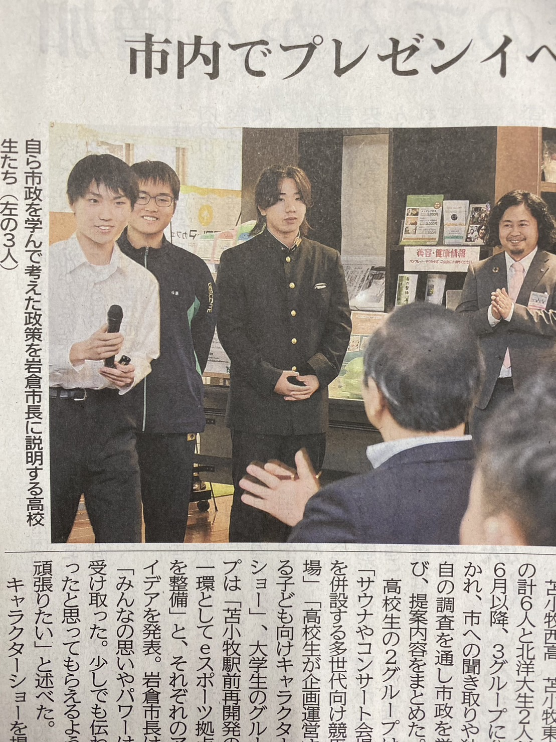 苫小牧西高校、苫小牧東高校の生徒さんと北洋大学の学生さん計8名がABCの3チームに分かれ、本日の岩倉市長へのプレゼンのために汗水垂らし準備されてきました期待する将来の苫小牧に導くアイデアを力強く披露していただきました。